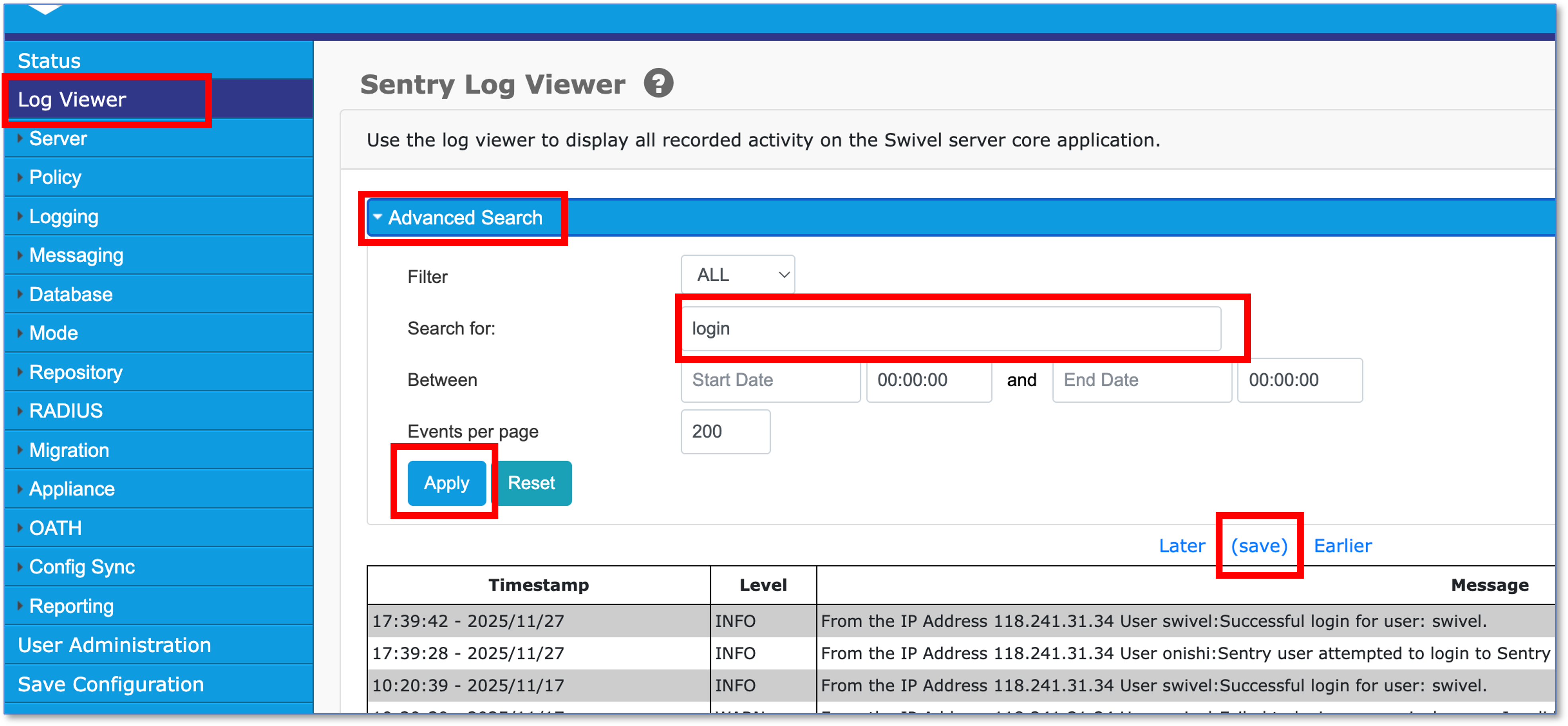 (5)対象となるログが表示されたら、「(save)」をクリックします。