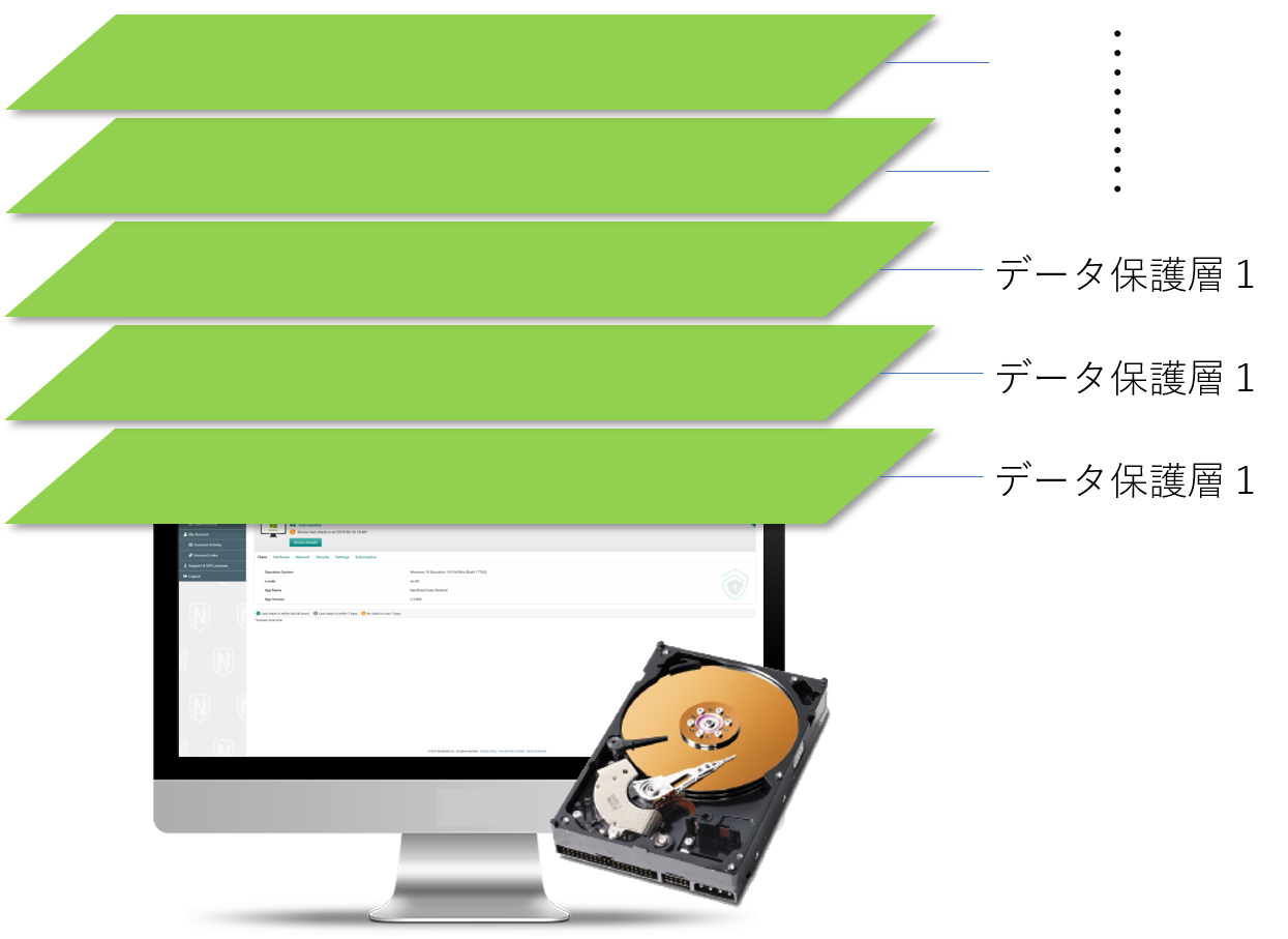 NeuShieldはBoot領域、ディスク領域、ファイル・フォルダ領域それぞれのデータ保護層を作成します。データ保護層はランサムウェア等からの攻撃から完全にBlockし、かつ、ユーザ自身による変更は差分管理をしていきます。