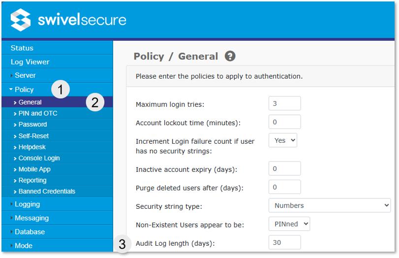 それから、「Policy -> General」メニューで、ログの長さを設定できます。