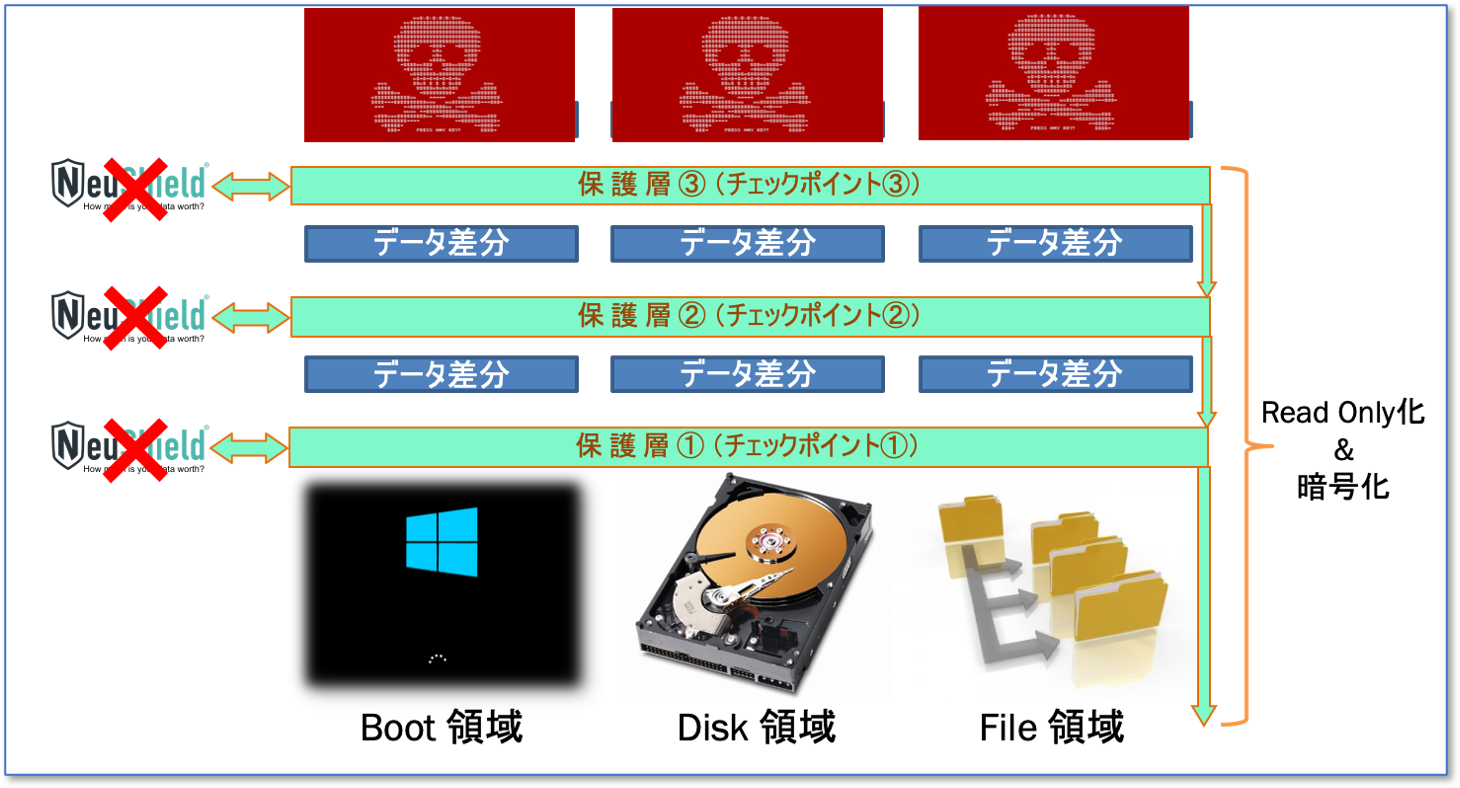 NeuShieldは設定されたタイミングで保護層とも表現されるチェックポイントを作成し、配下のデータをRead Only化、暗号化して守ります。