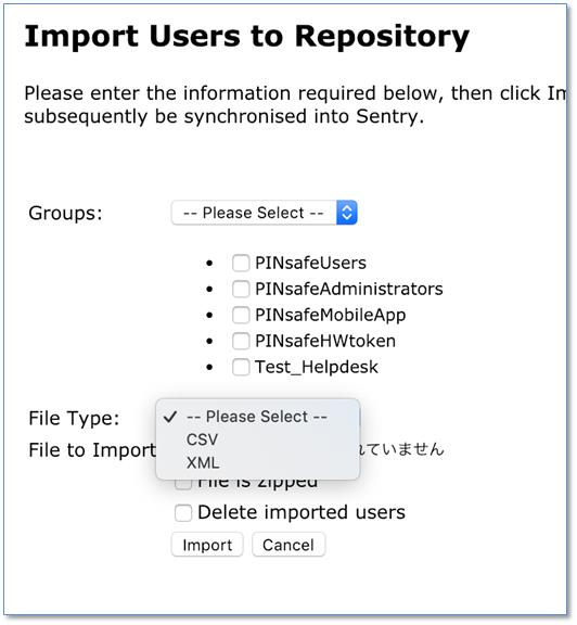 Import Users to Repositoryメニューの「File Type:」から「CSV」を選択します。