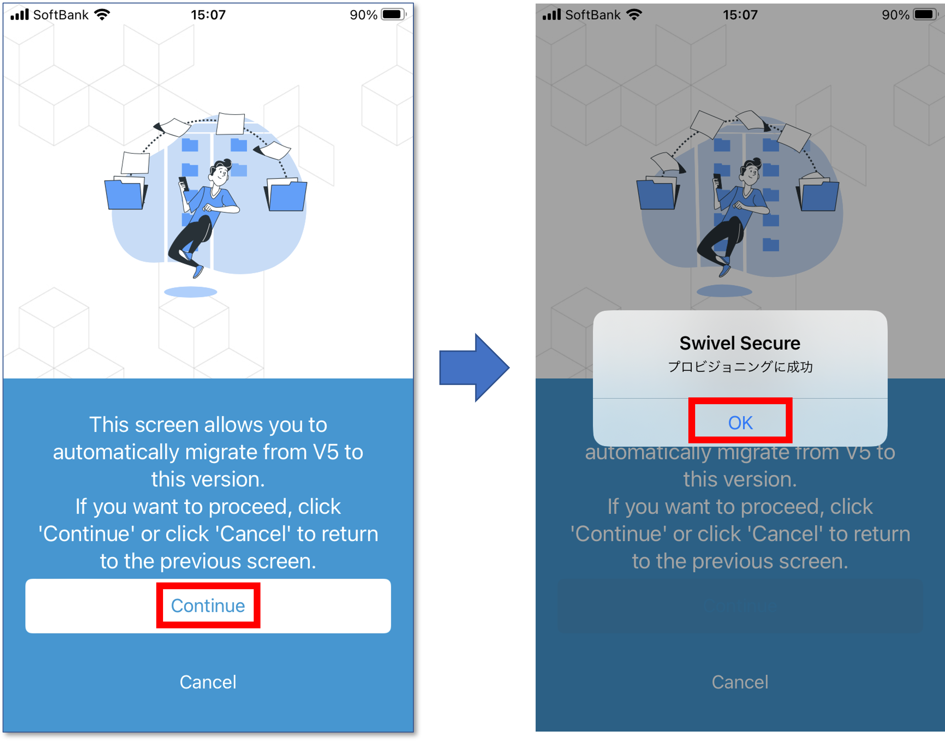 続いて、Mobile App V5からの環境移行の画面が表示されますので、「Continue」をタップします。Mobile App V5からのプロビジョニングを含む環境移行が完了すると「プロビジョニングに成功」と表示されますので「OK」をタップします。
